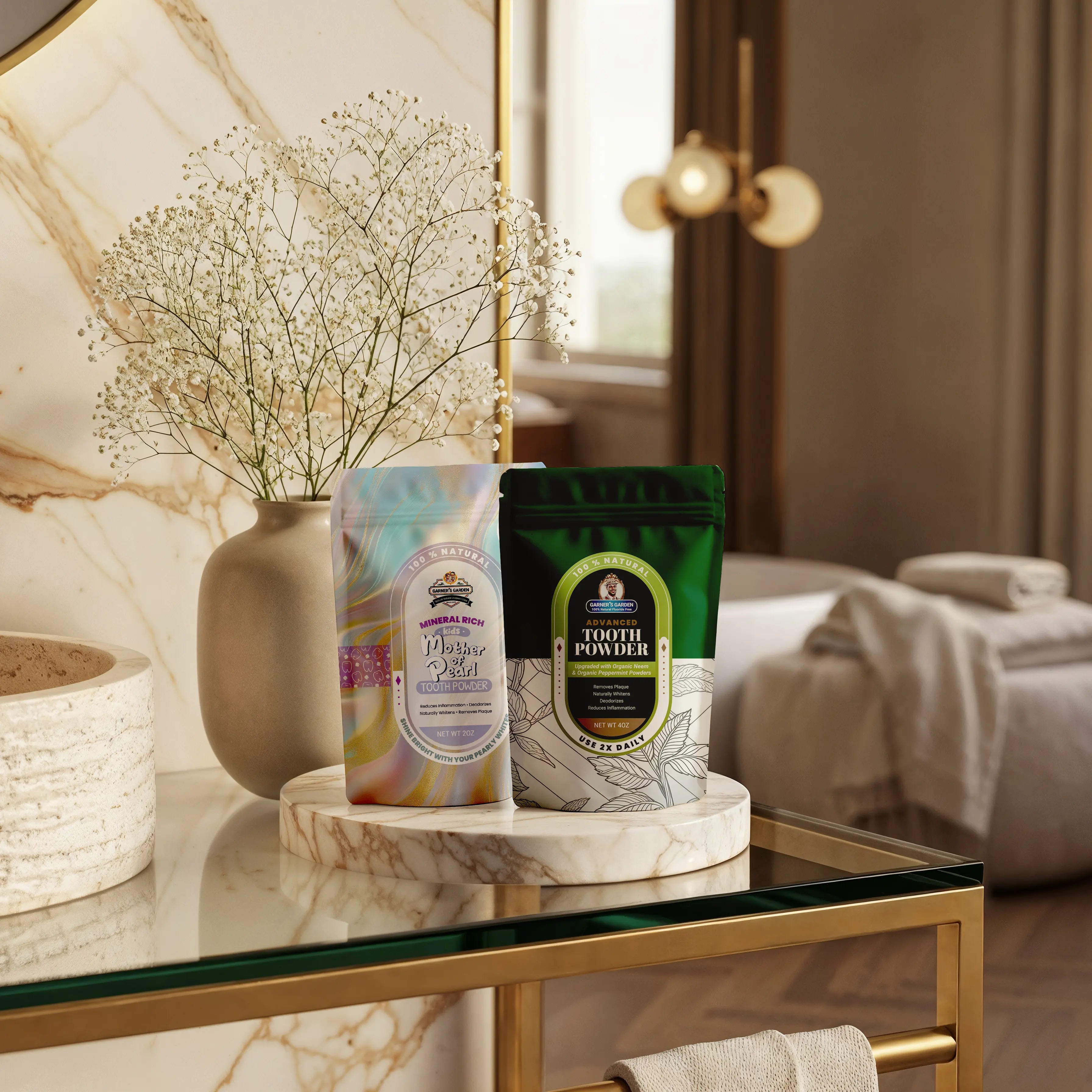 *Each set of antibacterial mouthwash and activated charcoal toothpaste powder has the option to add organic neem powder and organic peppermint powder to the tooth powder.