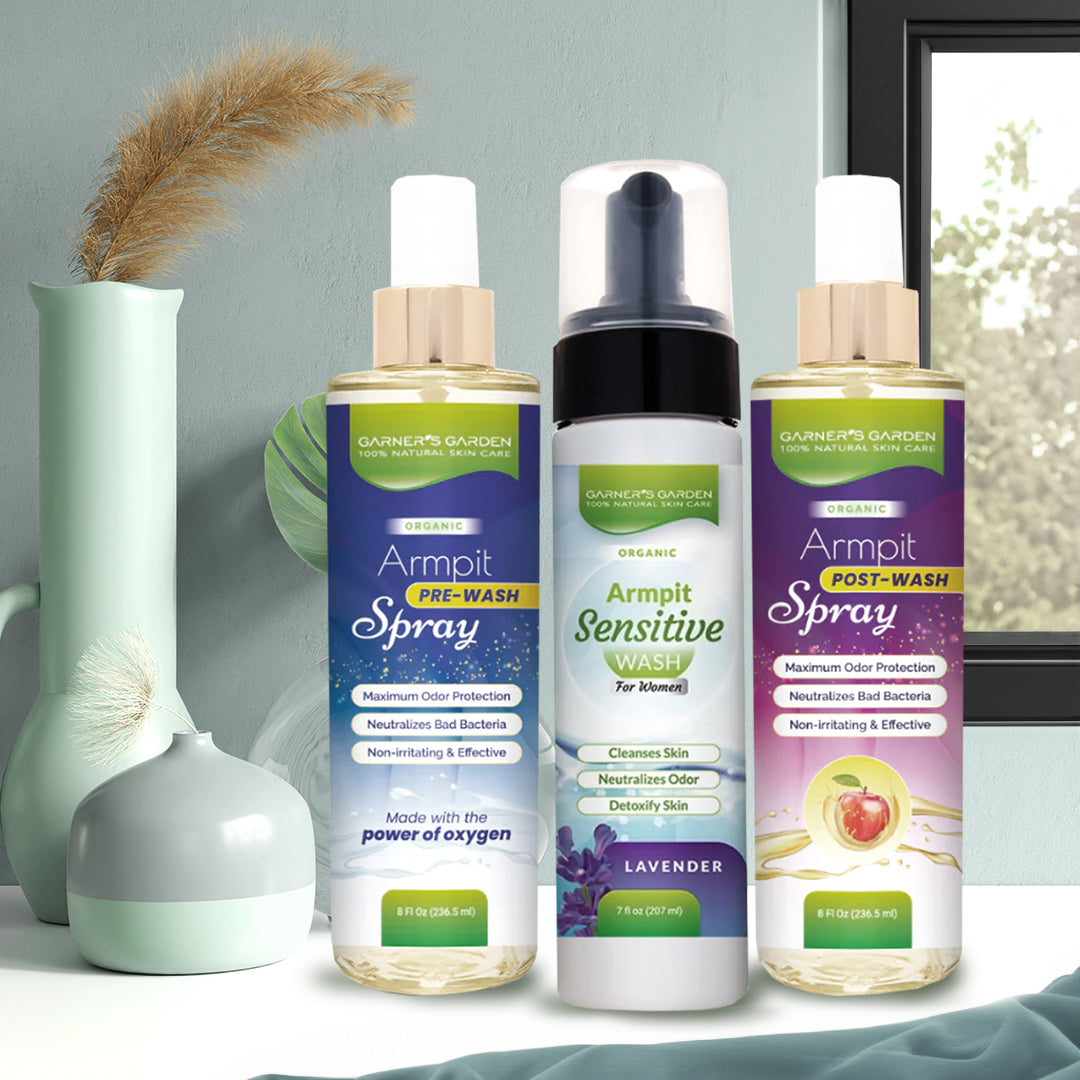 The Underarm Odor Control & Brightening System is a complete three-step routine designed to eliminate odor at the source, cleanse deeply, brighten dark underarm skin, and improve the performance of natural deodorant. This system uses oxygen-based cleansing, plant-derived surfactants, and pH-balancing botanicals to create a cleaner, healthier underarm environment.